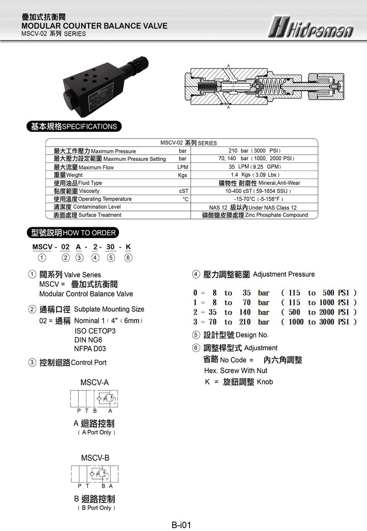 MSCV-02 Maximum Pressure : 210 BAR ( 3000 PSI )