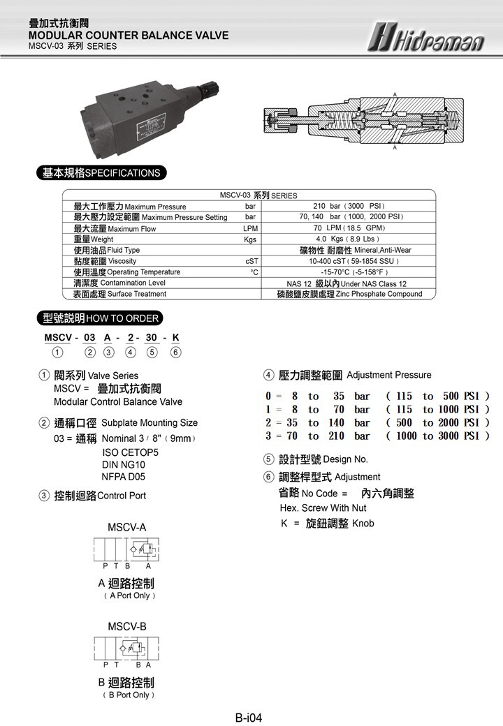 MSCV-03 Maximum Pressure : 210 BAR ( 3000 PSI )